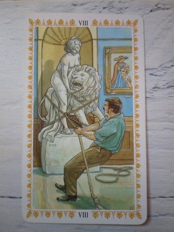 На карте мы видим мужчину, который пытается сдвинуть с места скульптуру девушки, приручающую льва. На стене висит картина, похожая сюжетом на скульптуру. Цвет карты голубой.
