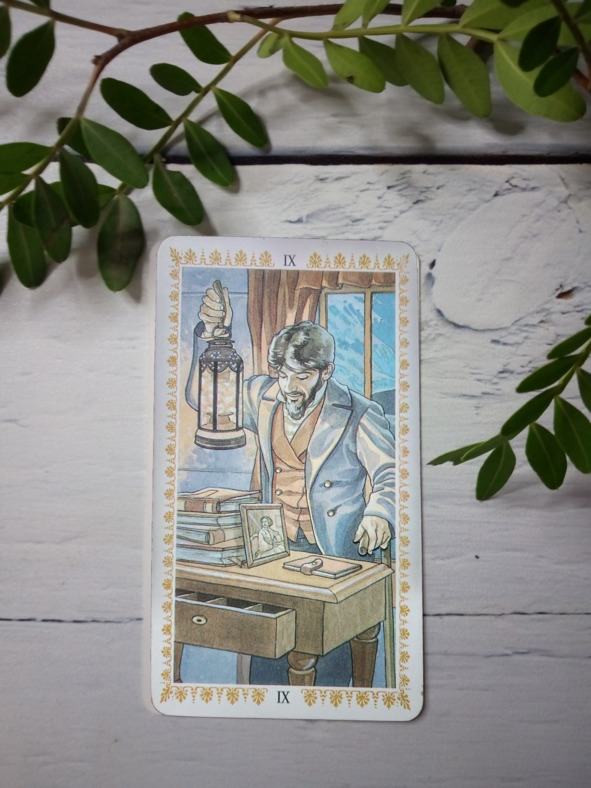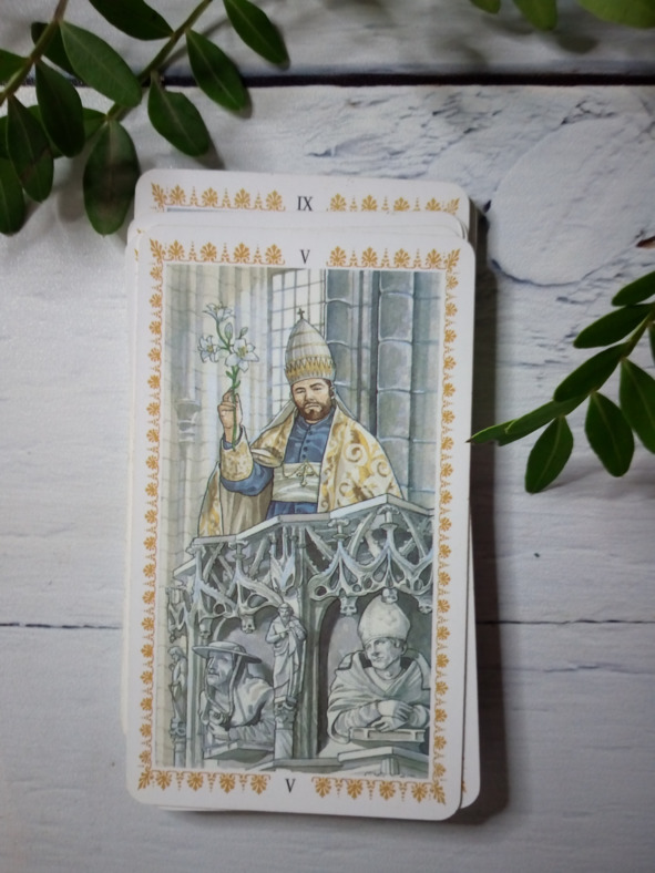 На карте мы видим мужчину, в стенах храма. Да и сам мужчина похож на человека, занимающегося религией. В руке лилия. Очень интересен цвет одежды- основной цвет синий, поверх которого накинута мантия бело-желтого оттенка. Широкий пояс белого цвета доходит до самого сердца.