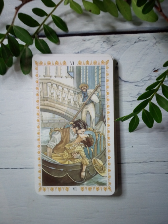 На карте мы видим влюбленную пару, катающуюся на гондоле по каналам Венеции, девушка уронила желтую шляпку в воду. Гондольер внимательно рассматривает влюбленных. Цвет карты бежево-голубой.