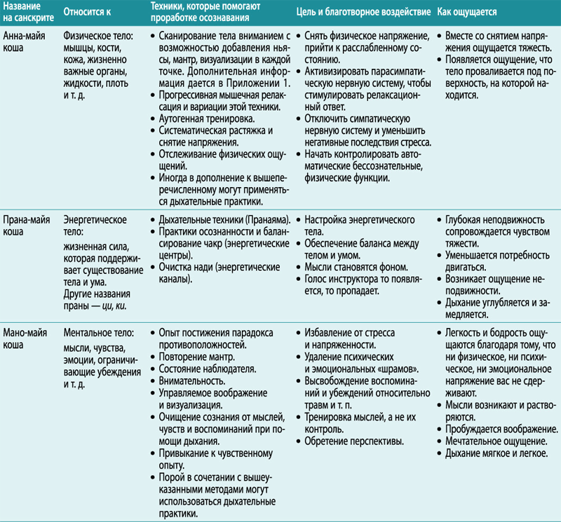 Я хочу представить вашему вниманию очень удобную таблицу, которая поможет вам объединить конкретные принципы с практической стороной их применения, их целью и благотворным воздействием, а также узнать, как именно ощущается восприятие каждой коши. Перечисленные техники используются в медитациях Йога-нидры. В сокращенной таблице перед каждой медитацией указано, какие техники используются для каждой конкретной коши.
