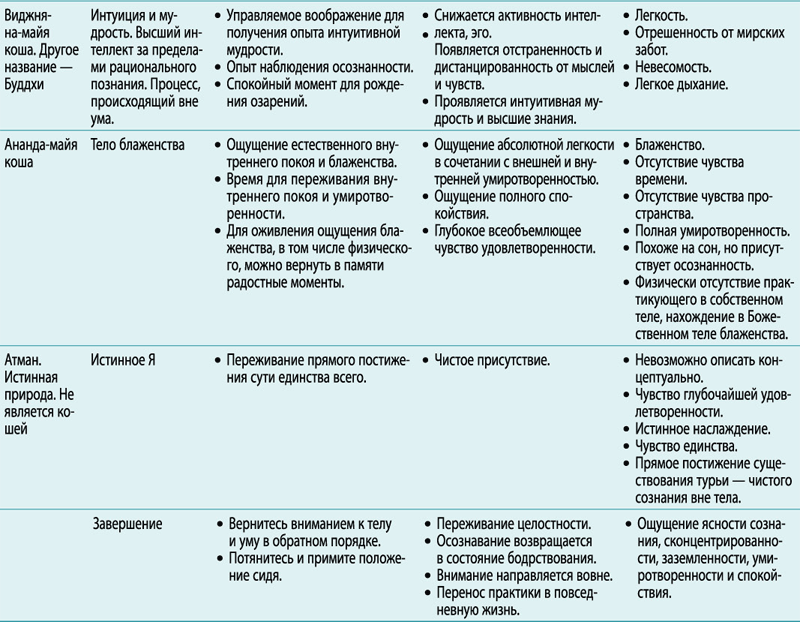 Практика пратьяхары – это продвижение по кошам при помощи медитации Йога-нидры. Она четкая и последовательная, как проверенный временем рецепт. Одни и те же ингредиенты (коши) включаются в работу в неизменном порядке – от самого грубого слоя (Анна-майя коша) до самого тонкого (Ананда-майя коша), как показано в приведенной ниже таблице. Таким образом, внимание естественным образом обращается вовне к нашему истинному Я, при этом даруя восхитительные преимущества нашим телу и уму.