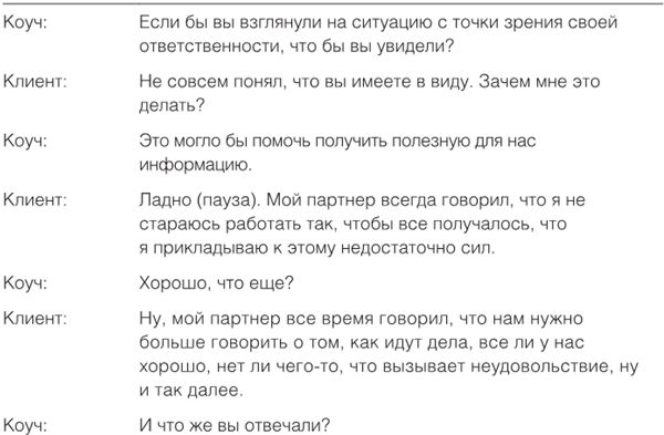 Если мы принимаем на себя ответственность за что-либо, это означает, что мы можем повлиять на это. Например, если я ответственен за свою удовлетворенность собственной работой, то именно мне следует что-то делать, если она меня не устраивает. Таким образом, коуч руководствуется принципом, по которому клиент в конечном итоге сам несет ответственность за свою жизнь и достигнутые им результаты. Это и его работа, и выбираемые им взаимоотношения, и место жительства, и проч.