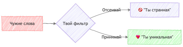 Самое страшное – когда чужие насмешки становятся твоим внутренним голосом. Замечай, когда ты начинаешь говорить с собой чужими словами: «Я странная», «Я не такая», «Со мной что-то не так». Эти мысли не твои.