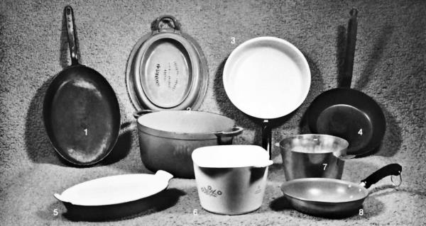Вот тяжелые сковороды из Франции, которые равномерно распределяют тепло и хорошо его держат: овальная чугунная сковорода (1) предназначена для обжаривания мяса и птицы и для жарки рыбы: в круглой сковороде с длинном ручкой (4) хорошо готовить омлеты. Алюминиевый сотейник с прямыми стенками, толстым дном и антипригарным покрытием (3) предназначается для обжаривания продуктов и готовки на плите; сковорода из того же материала со скошенными стенками и длинной ручкой (8) используется для универсальной жарки. В 7-8-литровой овальной эмалированной кастрюле с толстым дном (2) хорошо готовить супы, тушить овощи и мясо. Овальная эмалированная форма для запекания (5) уместна нс только на плите и в духовке, но и на с голе. А вот два примера универсальной формы для запекания, суфле и сервировки – французская жестяная форма для шарлотки (7) и ее американский эквивалент из огнеупорной керамики (6). I Наверху)