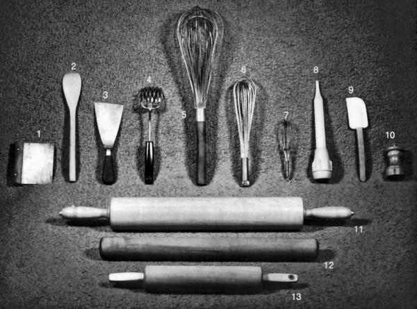 Эти вещи предназначены для удобства повара: французский скребок для теста (1) и его американский эквивалент – мастихин (3) помогают очищать рабочую поверхность, когда вы вымешиваете тесто или помадку. Французская деревянная лопатка (2) более удобна для взбивания соусов, чем ложка. Вилка с плоскими зубцами (4) разминает и смешивает мягкую пищу. Большой проволочный венчик (о) служит для взбивания яичных белков, средний венчик (б) для всего остального, а мини-венчик (7) управляется там, где не могут остальные. Кулинарная груша (8) и силиконовая лопатка (9) – два замечательных американских вклада в кулинарию. Мельницу для перца выбирайте такую, которая исправно мелет перец, например французскую Peugeot (10). Купите большую, тяжелую скалку, такую как американская поварская на подшипниках (11) или французская скалка для теста из твердой древесины (12); а вот 25-сантиметровая легкая скалка практически бесполезна (13). (Наверху справа)