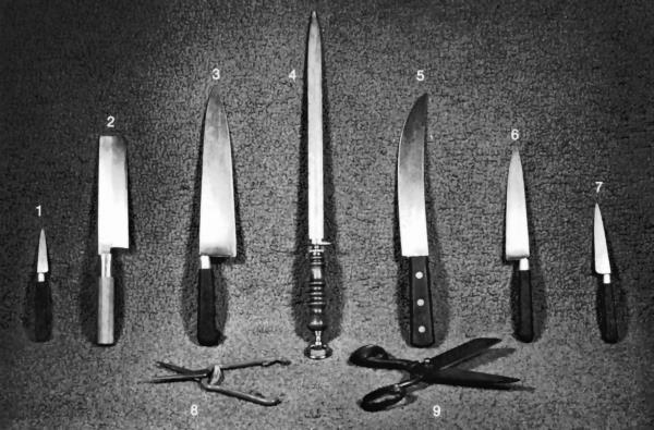 Острые как бритва ножи необходимы для успешной работы повара. Лучше выбирать ножи нс нержавеющие, а из углеродистой стали, так как она лучше затачивается. Если вы не можете купить подходящие ножи, спросите у вашего мясника, где он их покупает. Универсальные поварские ножи служат для разделки и нарезки мяса. Они бывают разной величины, от 25-сантиметрового лезвия до совсем маленьких (1, 3. 6 и 7). Японский нож с прямым лезвием (2) прекрасно рубит мясо, а ножом скимитар (5) очень удобно нарезать мясо и бекон. Профессиональная ножеточка (мусат) (4) поддерживает ножи в рабочем состоянии. Еще купите ножницы для лобстеров (8) (если вы любите морепродукты) и большие кухонные ножницы (9) для всего остального, от рыбьих плавников до вощеной бумаги. (Внизу)