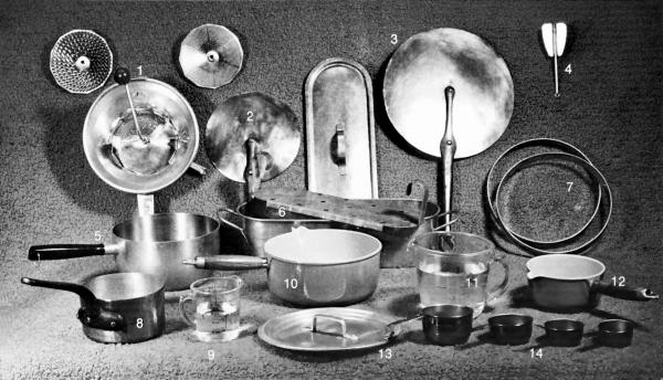 Для пюрирования супов, фруктов и овощей трудно найти лучшего помощника, чем импортный французский кухонный комбайн со съемными дисками (1). Бот крышка, которая подходит к кастрюлям разного диаметра и этим экономит место: хорошим примером служат французские медные крышки (2 и 3) с длинными ручками или алюминиевая крышка с делениями (13). Надежный мясной термометр (4) станет хорошим помощником при жарке мяса. Кастрюли с толстым дном, например алюминиевые, с покрытием из нержавеющей стали (5), эмалированные железные (10 и 12) или медная с покрытием из олова (8), послужат вам долгие годы. Кастрюля для при пускания рыбы с покрытием из олова, со съемной решеткой и крышкой (б) – это полезная роскошь. Из отдельных металлических бортиков (7) легко сложить форму для выпечки, положив их на противень. Стеклянные кружки с делениями (9 и 11) точно отмеряют жидкость, а для отмеривания сыпучих продуктов, например муки и сахара, пригодится такой набор чашек из нержавеющей стали с длинными ручками (14).