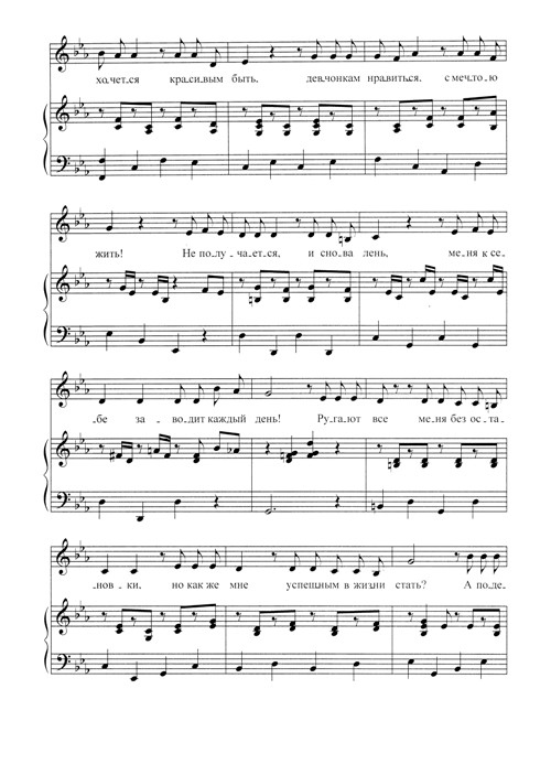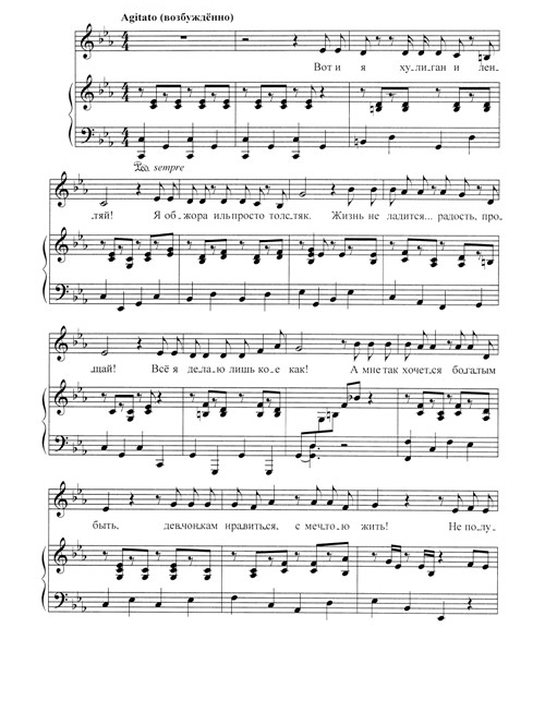Юноша. (Разговаривая сам с собой.) Почему у меня ничего не получается? Все меня ругают: и в колледже, и дома, но не одни же я двойки получаю? Тройки тоже бывают!.. А может, я болен, причём всегда… (Трогает рукой свою голову, а затем горло, при этом издаёт горловой протяжный и сиплый звук: А-а-а…) Одна лишь радость – за компьютером посидеть, да и то предки не дают. Только сядешь… пол дня ещё не пройдёт, а они уже настроение портят: иди, посуду мой, пол подмети, зарядку сделай!.. И невдомёк им, что у меня своих дел полно: е-майл проверить, в чат сходить… (Смотрит на свои штаны и обувь)Прикид совсем уже не модный… и компьютер обновить не помешало бы… Эх, если бы я был богатым, можно было бы ничего не делать и ни о чём не беспокоиться!.. (Мечтательно задумывается.)