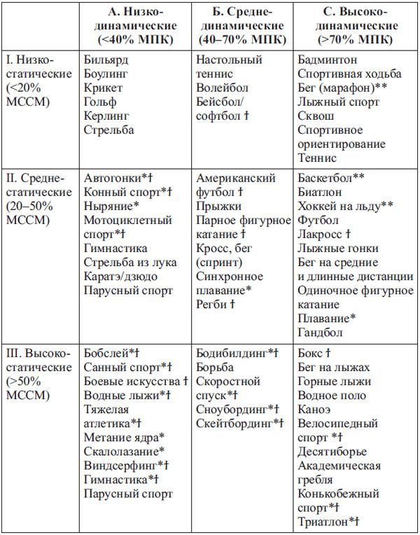 В таблице 2 представлена классификация, предложенная J. Mitchell (Mitchell J. et al., 2005), где все виды спорта, в зависимости от интенсивности статических и/или динамических нагрузок, разделены на три основные группы.