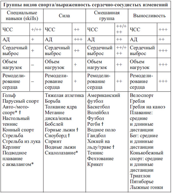 Примечание: (+) – умеренные нагрузки, умеренные сердечно-сосудистые изменения; (++) – значительные нагрузки, значительные сердечно-сосудистые изменения; (+++) – предельные нагрузки, предельные сердечно-сосудистые изменения; * – вид спорта с высоким риском тяжелого повреждения или смерти для спортсмена и/или зрителей в случае обморока; ϯ – вид спорта с повышенным риском столкновения спортсмена.