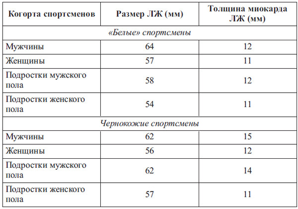 Проведенные исследования позволили верхним пределом нормы для толщины миокарда у взрослых чернокожих спортсменов мужского пола считать 15 мм, у женщин – 12 мм, у чернокожих юношей-спортсменов – 14 мм, у девушек – 11 мм (Wilson M. G., Drezner J. A., Sharma S., 2017).