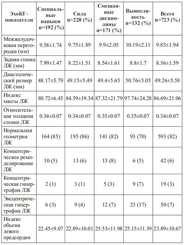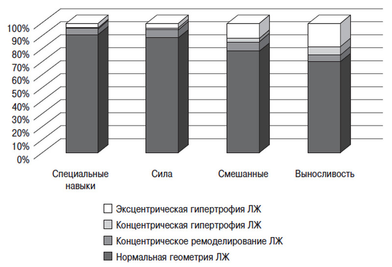 Доля спортсменов с концентрической гипертрофией миокарда оказалась минимальной – 1 %, 1 %, 3 % и 7 % соответственно в группах: специальные навыки, сила, смешанные дисциплины и выносливость. В среднем эта цифра составила 3 %, что сопоставимо с данными исследований, основанных на измерении толщины миокарда у спортсменов.