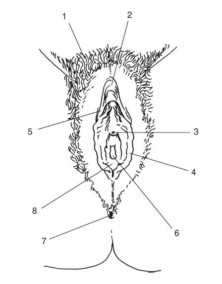 1 – лобок, 2– клитор, 3– отверстие мочеиспускательного канала, 4– малые половые губы, 5— большие половые губы, 6– входное отверстие влагалища, 7— анальное отверстие, 8– луковица преддверия