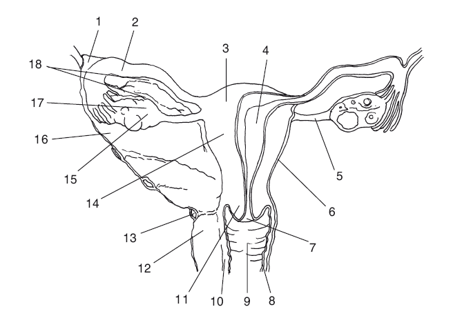 Рис. 2. Строение внутренних женских половых органов:1,5 – подвешивающая яичник связка, 2 – маточная труба (яйцевод), 3 – дно матки, 4 – полость матки, 6 – цервикальный канал, 7 – канал шейки матки, 8 – внутренняя, слизистая оболочка влагалища,9—влагалище, 10 – мышечная оболочка влагалища, 11 – цервикс, шейка матки, 12 – латериальный (боковой) свод, 13 – уретро-крестцовая связка, 14 – тело матки, 15 – яичник, 16 – брыжейка матки,17 – брыжейка яичника, 18– брыжейка маточной трубы