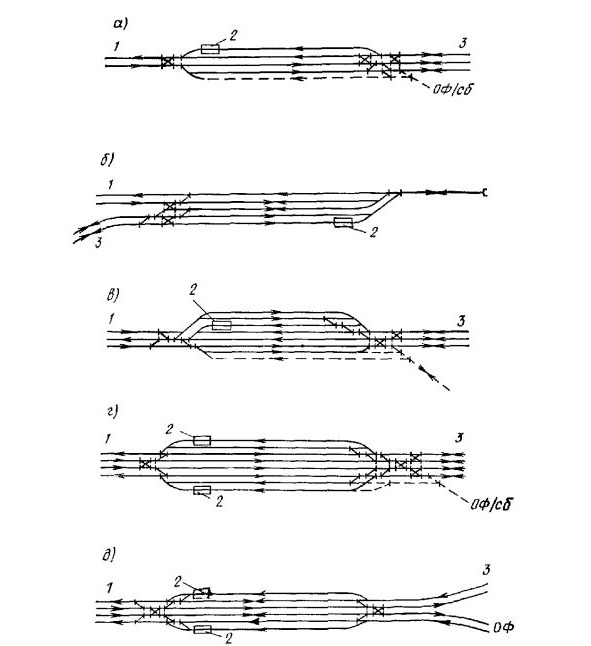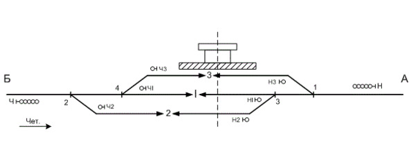 Обгонным пунктом (рис.2.3.) называется раздельный пункт на двухпутных линиях, имеющий путевое развитие, допускающее только обгон поездов. Обгонные пункты в большинстве случаев имеют один приемоотправочный путь (кроме главного) на каждое направление движения. Для приема поездов на неправильный путь или отправления с него служат диспетчерские съезды.