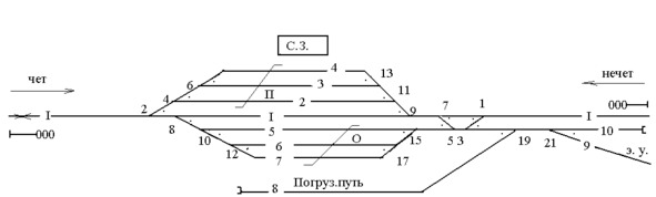При наличии на станции главных путей их нумеруют римскими цифрами (I, II, Ш и т.д.); по нечетному направлению – нечетными цифрами, по четному направлению – четными (рис.2.11.). Когда к станции примыкает с «Одной стороны двухпутная линия, а с другой – однопутная, главные пути в пределах станции нумеруют по двухпутному подходу. Если двухпутную линию пересекает или примыкает к ней одна или две однопутные линии, то главным путям однопутных линий присваиваются соответственно номера III и IY.