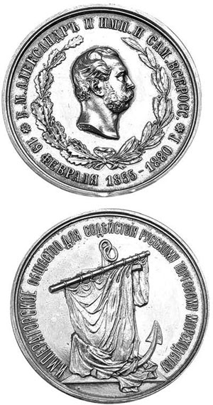 Медаль Императорского Общества для содействия русскому торговому мореходству. Санкт-Петербургский монетный двор, 1880 г. Медальеры: лицевой стороны – В. В. Алексеев (на обрезе: В. А.), оборотной стороны – А. Г. Грилихес (отец)