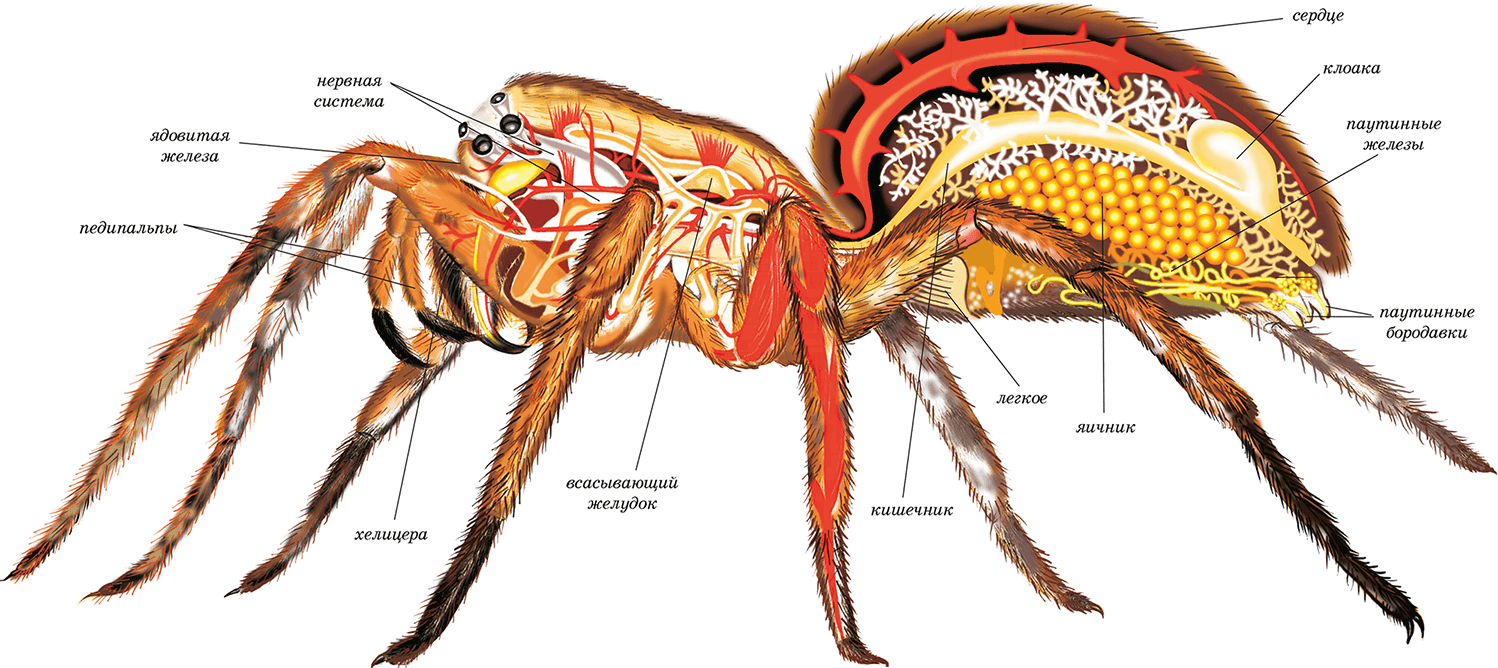 Тело паука разделяется на головогрудь и брюшко. Головогрудь образовалась в результате слияния шести сегментов (головных и грудных), седьмой сегмент у большинства пауков почти полностью редуцирован. На головогруди располагаются восемь простых глазков, которые видят не очень хорошо, когтевидные челюсти (хелицеры), заканчивающиеся чаще всего когтем, в который открывается проток ядовитой железы, и чувствительные ножки-педипальпы (органы осязания). Педипальпами пауки ощупывают все вокруг, используя их как руки – трогают ими добычу, умываются; самки ими зашивают кокон с яйцами. У самцов педипальпы выполняют роль органов размножения – их концы раздуты в форме луковицы. Они заполняются семенем перед спариванием и используются для введения семени в половые органы самки.