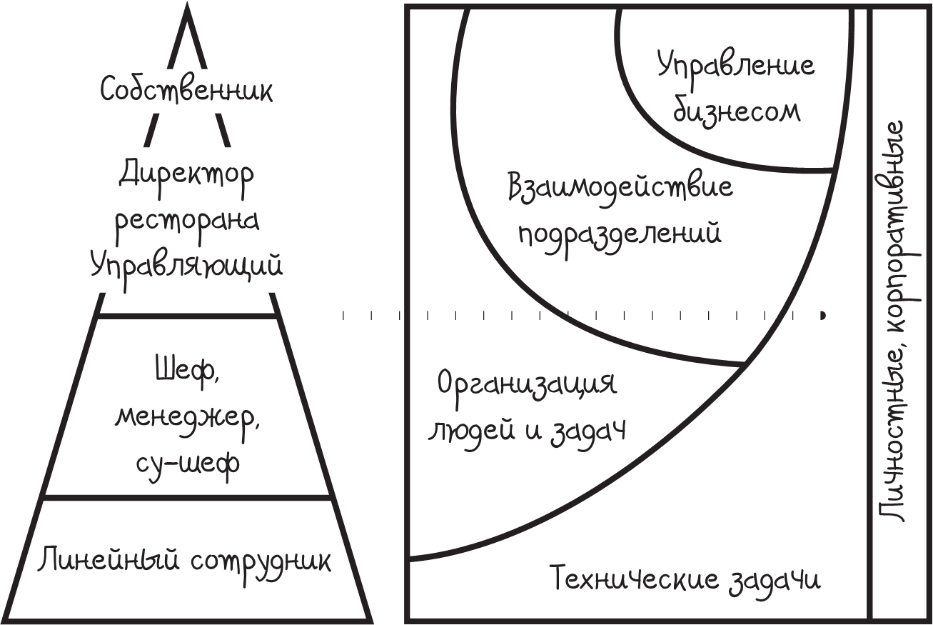 Руководители среднего звена (директора, управляющие ресторанов, шеф-повара) совмещают три приоритетные области. Они должны знать специфику работы (технические компетенции), уметь организовать работу людей и регулировать процессы взаимодействия подразделений (управленческие компетенции).