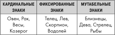 Кардинальные знаки – это воплощение будущего, которое они создают своей активностью. Фиксированные знаки призваны сохранять то, что уже имеется, а значит, они обращены в прошлое. Мутабельные знаки умеют жить здесь и сейчас – лавировать, подстраиваться и перестраиваться.