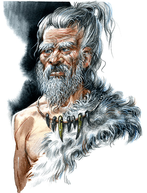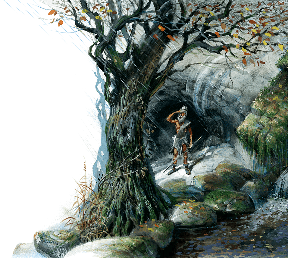 На пороге пещеры показался высокий, сухощавый старик с загорелой морщинистой кожей. Его длинные седые волосы были приподняты и связаны пучком на темени. Его мигающие красные веки были воспалены от едкого дыма, вечно наполняющего пещеру. Старик поднял руку и, прикрыв ладонью глаза под густыми, нависшими бровями, взглянул по направлению к реке. Потом он крикнул: