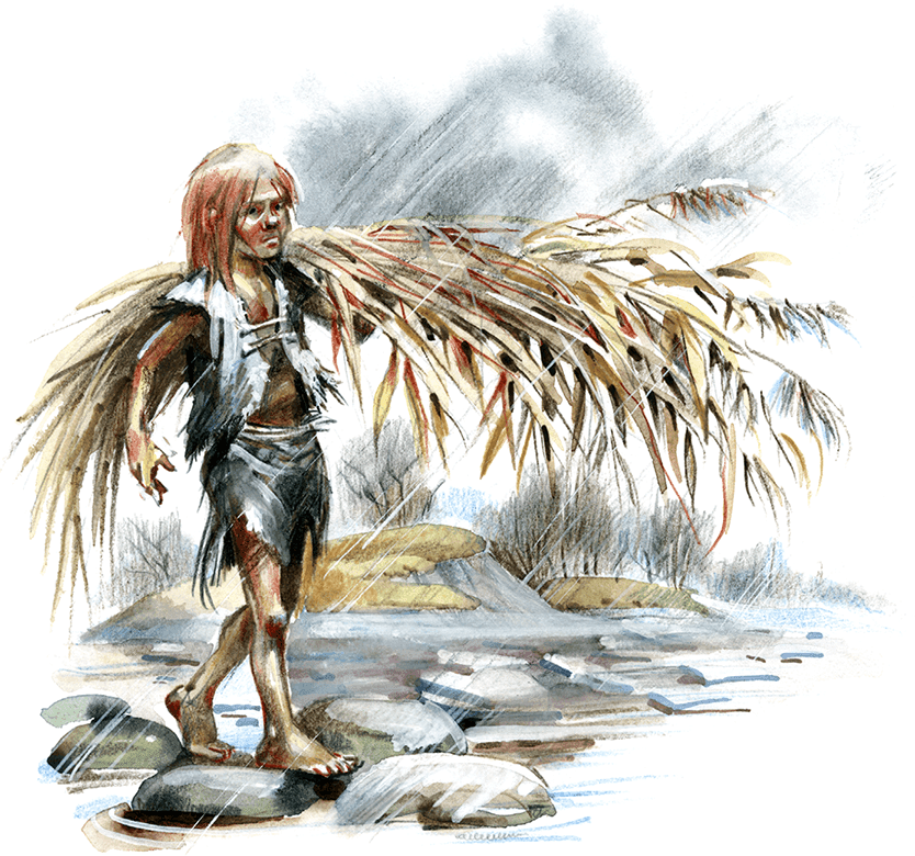 – Дитя, – ответил старик, – все наши ушли ещё до зари в леса на охоту за оленями и широкорогими быками. Они вернутся только к вечеру, потому что – запомни это – дождь смывает следы животных, уничтожает их запах и уносит клочья шерсти, которые они оставляют на ветвях и корявых стволах деревьев. Охотникам придётся много потрудиться, прежде чем они встретят добычу. Значит, до самого вечера мы можем заниматься своими делами. Оставь свой тростник. У нас довольно древков для стрел, но мало каменных наконечников, хороших резцов и ножей: все они обточились, зазубрились и обломались.