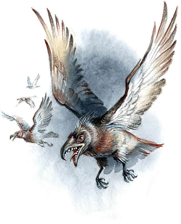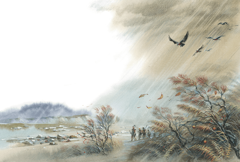 Дети поминутно оборачивались и смотрели назад. Они всё ещё слышали шум летевших птиц. Им чудилось, что их настигает один из тех прожорливых зверей, которые, наверное, следовали за жуткой льдиной.