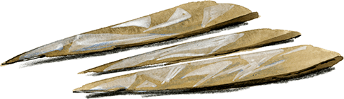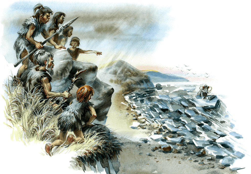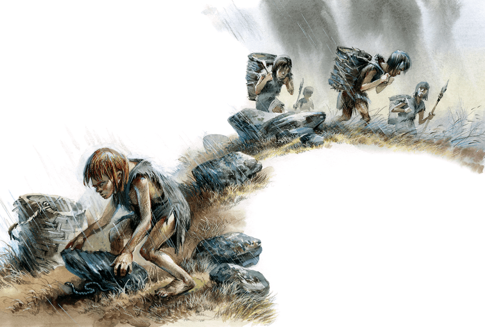 Маленькими плоскими кремнями с искусно зазубренными острыми краями женщины соскоблили шерсть и отделили жилки с тяжёлых шкур. Затем они разрезали кожи на небольшие куски.