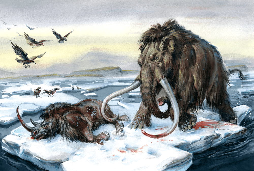 Рядом с ним лежал огромный косматый носорог, поразивший своим рогом мамонта, – лежал неподвижно и безмолвно, задушенный своим могучим врагом.