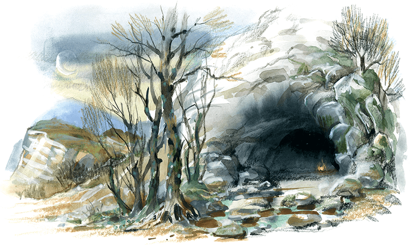 Недалеко от мальчика, на скате холма, чуть повыше того места, где река омывала холм, зияла, точно громадная разинутая пасть, широкая чёрная дыра, которая вела в глубокую пещеру.