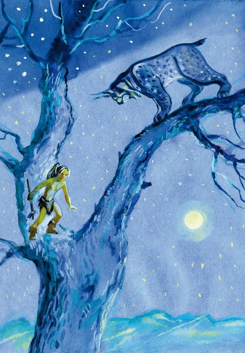 Шум разбудил детей. Дрожа от страха, они повскакали со своих мест и кинулись к старику. Старейший велел им немедля забраться на вершину почти отвесной скалы. Дети тотчас принялись карабкаться кверху, ловко цепляясь руками за каждый выступающий камень, пользуясь каждой выбоиной в скале, чтобы поставить ногу. На небольшом уступе, неподалёку от вершины, они улеглись на живот, облизывая ободранные в кровь пальцы.
