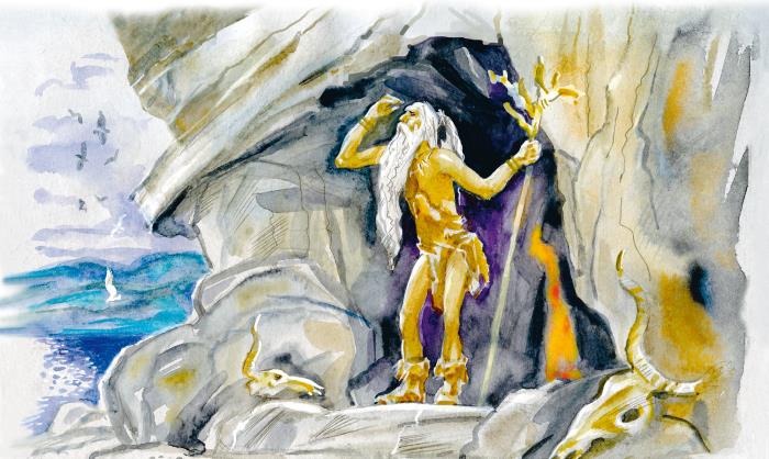 На пороге пещеры показался высокий, сухощавый старик с загорелой морщинистой кожей. Его длинные седые волосы были приподняты и связаны пучком на темени. Его мигающие красные веки были воспалены от едкого дыма, вечно наполняющего пещеру. Старик поднял руку и, прикрыв ладонью глаза под густыми, нависшими бровями, взглянул по направлению к реке. Потом он крикнул: