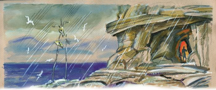 Недалеко от мальчика, на скате холма, чуть повыше того места, где река омывала холм, зияла, точно громадная разинутая пасть, широкая чёрная дыра, которая вела в глубокую пещеру.