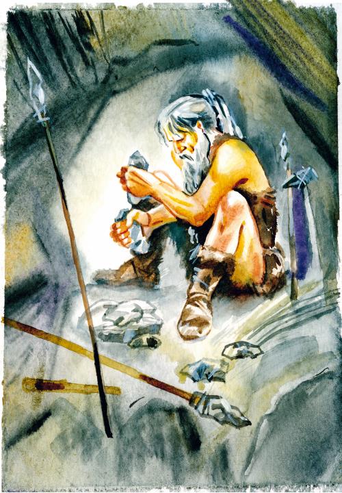 – Дитя, – ответил старик, – все наши ушли ещё до зари в леса на охоту за оленями и широкорогими быками. Они вернутся только к вечеру, потому что – запомни это – дождь смывает следы животных, уничтожает их запах и уносит клочья шерсти, которые они оставляют на ветвях и корявых стволах деревьев. Охотникам придётся много потрудиться, прежде чем они встретят добычу. Значит, до самого вечера мы можем заниматься своими делами. Оставь твой тростник. У нас довольно древков для стрел, но мало каменных наконечников, хороших резцов и ножей: все они обточились, зазубрились и обломались.