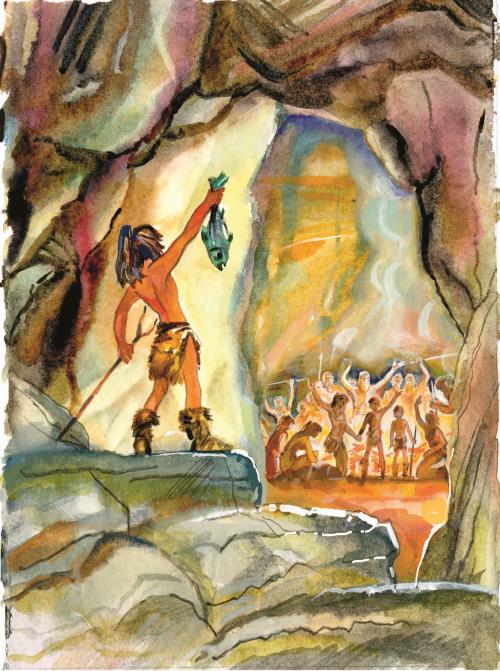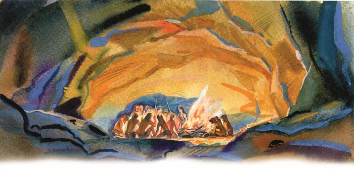 Ожо гордился этим. Он знал, что огонь – самая большая драгоценность в пещере; если огонь погаснет, его ждёт страшное наказание. Поэтому, едва мальчуган замечал, что пламя уменьшается и грозит потухнуть, он начинал быстро подбрасывать в костёр ветки смолистого дерева, чтобы вновь оживить огонь.