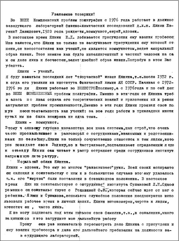 Привожу ксерокопию этой анонимки, к счастью, оригинал у меня сохранился. Это подлинный документ эпохи, и её автор тоже мой современник, причём его доля в общем портрете достаточно значительна.