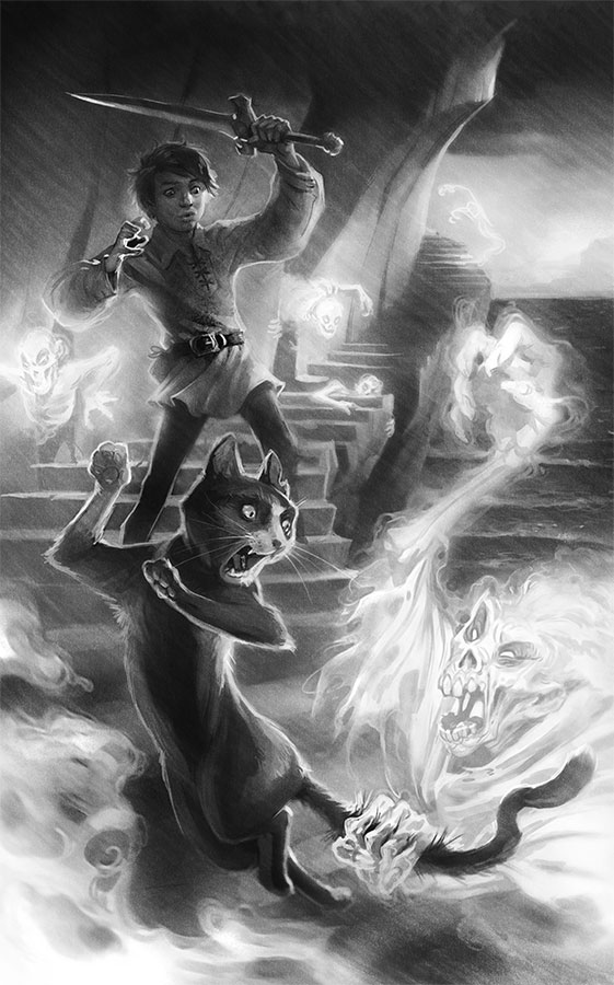 Внезапно в хвост Элдвину кто-то вцепился мертвой хваткой. Длинные тонкие пальцы с острыми ногтями тянулись к нему откуда-то из-под лестницы. Кот вырвался, оставив врагу клок шерсти. Из скалы тянулись все новые и новые руки; полные ненависти призраки острова выскальзывали из щелей в камне. Лица у них были вытянутые, а рты застыли в вечном крике.
