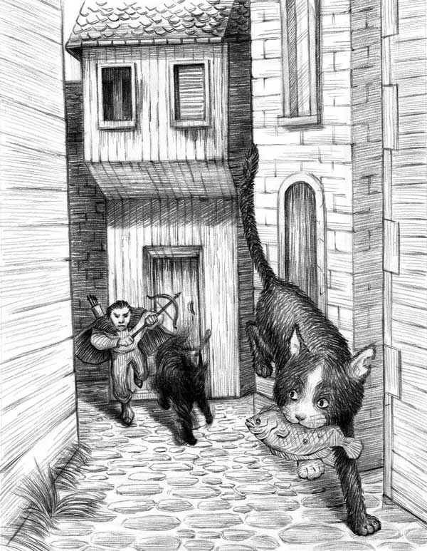 На долю секунды Элдвин замешкался, раздумывая: то ли бежать без оглядки, то ли попытаться все-таки вернуть себе рыбу, которая теперь болталась на деревянном бочонке, пришпиленная к нему стрелой… Вторая стрела взъерошила шерсть на голове у Элдвина, и это заставило его сделать выбор. Кот опрометью кинулся за угол, к первому же окну, которое попалось ему на глаза, и прыгнул навстречу неизвестности.
