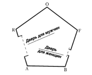 Дома наши чаще всего имеют форму пятиугольника. Две северные стороны RO, OF образуют крышу, и в них, как правило, не прорезают дверей. В восточной стороне имеется небольшая дверка для женщин, а в западной прорезана дверь гораздо больших размеров – для мужчин. В южной стене (или в полу) дверей обычно не делают.