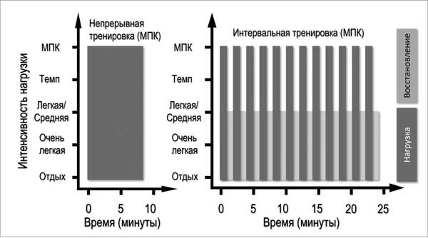 Рисунок 1.1. Схематичное представление соотношения нагрузки (на примере нагрузки с МПК-интенсивностью) при непрерывной и интервальной тренировке: интервальная тренировка обеспечивает возможность выполнения большего объема упражнения с высокой интенсивностью