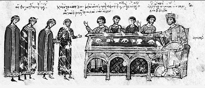 Илл. 1.1. Военачальник предлагает своих дочерей в жены гостям во время пира, миниатюра Мадридского Скилицы