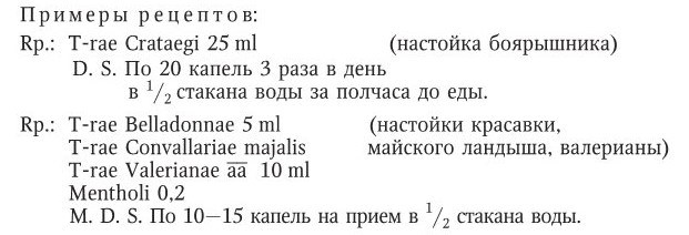 Настойки. Представляют собой окрашенные жидкости, как правило, с приятным запахом. Сохраняют настойки в хорошо закупоренной посуде в прохладном месте. Отпускают во флаконах (в рецепте не указывается), а дозируют в каплях. Иногда их добавляют в другие жидкие формы, обозначая количество в мл или числом добавляемых капель (римской цифрой, например gtts. X). В рецептах на отпуск настойки указывают ее объем в мл, который должен соответствовать заводской расфасовке. Настойки иногда комбинируют друг с другом, сохраняя отношение дозировок каждой настойки в смесях.