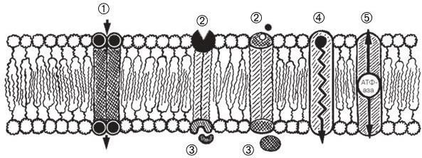 В конечном счете любой барьер построен из суммы оболочек (мембран) входящих в него клеток, а эти мембраны при некоторых различиях имеют принципиально одинаковое строение. Согласно современным представлениям, основу их составляет двойной слой фосфолипидов, гидрофильные «головки» которых обращены к внешней и внутренней поверхностям мембраны, омываемым водной средой. Гидрофобные углеводородные «хвосты» молекул фосфолипидов направлены в толщу мембраны и формируют практически непроходимый слой для сильно полярных водорастворимых веществ. В липидную основу мембран погружены многочисленные белковые молекулы разных размеров и подвижности, часть из них прочно фиксирована на внешней поверхности мембраны, другие могут перемещаться от одной поверхности к другой (рис. 1). Некоторые пронизывают мембрану насквозь, образуя своего рода «трубки» — каналы со специфической проводимостью для ионов (натрия, калия, кальция, хлора). В невозбужденной клетке входы в такие каналы заперты зарядом, противоположным по знаку заряду проводимого иона. Под влиянием медиаторов, некоторых гормонов, распространяющейся волны деполяризации (нервного импульса, возбуждения мембраны клетки) входы в каналы могут открываться для «своих» ионов. Перемещение ионов идет из среды с большей концентрацией в среду с меньшей. Однако существует и активный перенос против большей концентрации, но он требует затраты энергии, которая черпается за счет гидролиза АТФ.