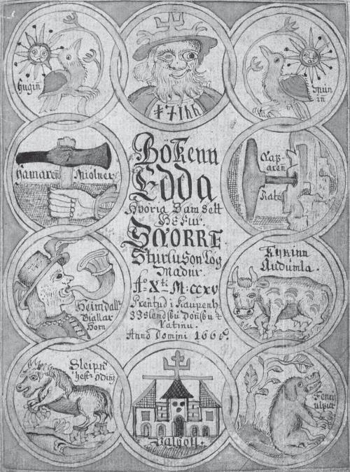 Титульный лист рукописи «Младшей Эдды», на котором изображены Один, Хеймдалль, Слейпнир и другие персонажи скандинавской мифологии. XVIII в. Национальная и университетская библиотека Исландии