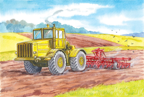 Сначала поле нужно вспахать. Пашут землю трактора. Существуют различные виды тракторов: пахотные, транспортные и др. Трактор от других транспортных средств отличается тем, что имеет низкую скорость и большую тягу.