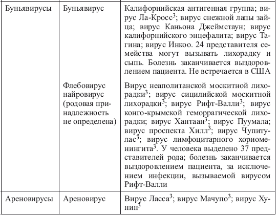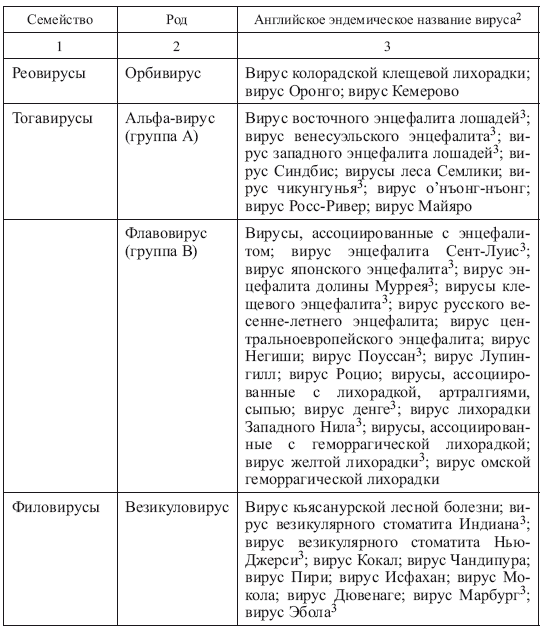В зависимости от преобладания клинико-патогенетического синдрома различают арбовирусные системные лихорадочные болезни, геморрагические лихорадки, энцефалиты и энцефаломиелиты. Более 250 антигенно различных арбовирусов сгруппированы в пять семейств (табл. 2). Геном большинства вирусов представлен односпиральный РНК, хотя некоторые из них (представители семейства Reoviridae) содержат двуспиральную РНК.