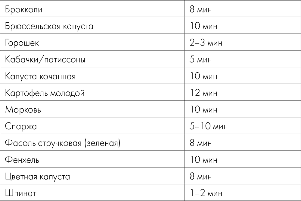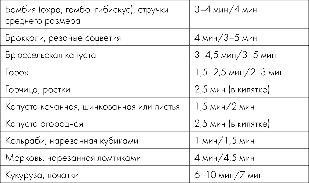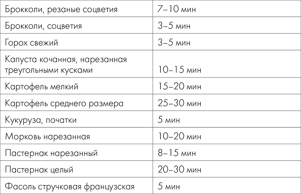 Поскольку после закладки овощей, морепродуктов или яиц температура воды понижается, время варки (см. таблицу) начинают отсчитывать от момента, когда вода снова закипит.