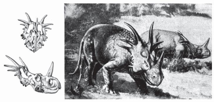 На рис. 1 показано развитие костных выростов на черепе Styracosaurus parksi, одного из видов так называемых рогатых динозавров, живших в позднемеловой эпохе (94–66 млн. лет назад). Об этом существе палеонтолог Лолл сказал, что «на его черепе шипы и отростки предаются разгулу» (Lull, 1933: 88). Зрелище, действительно, впечатляющее. Но для Давиташвили оно выглядит легко объяснимым. Вот как явление трактуется этим автором.