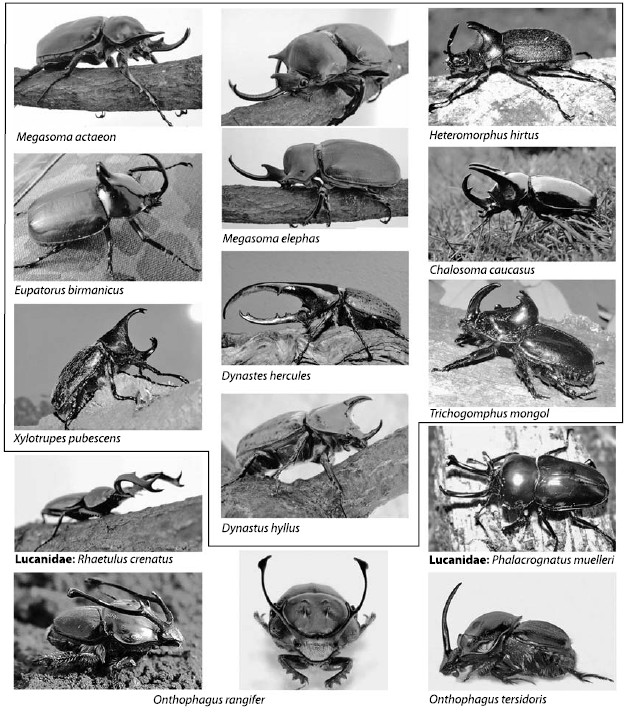 Рис. 2. Разнообразие головных выростов у рогатых жуков семейств Scarabaeidae (подсемейство Dynastinae – в рамке) и Lucanidae.