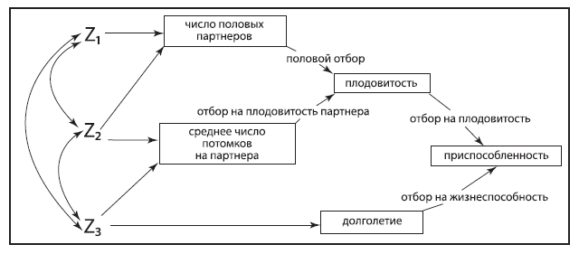 Рис. 1.2. Иерархия компонентов приспособленности, диктуемых разными формами отбора. Z1, Z2, Z3 – три гипотетические фенотипические признака. Стрелки с двумя остриями показывают корреляции между этими признаками. Из: Arnold, 1994.